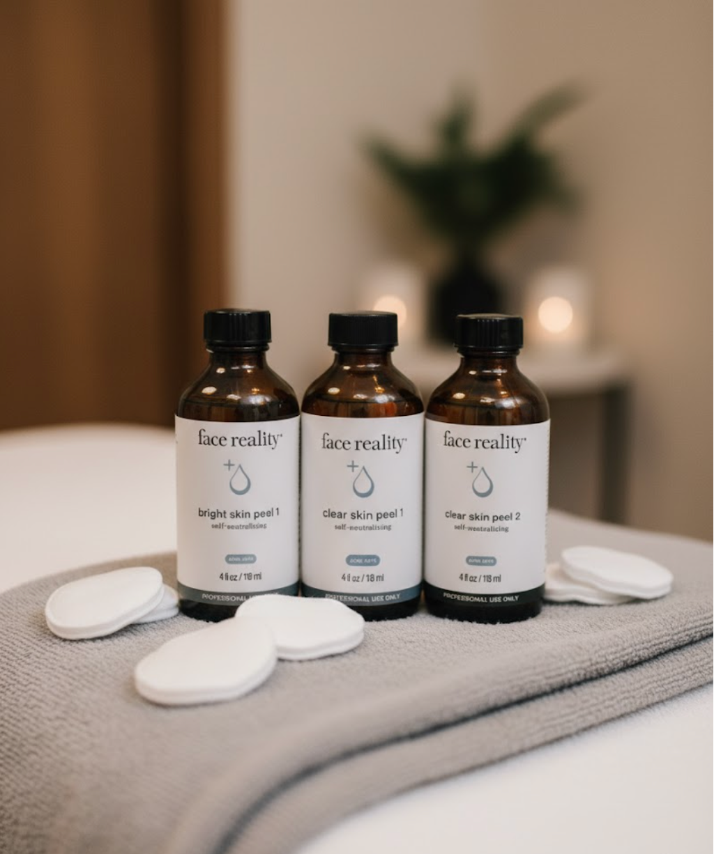 The Face Reality Peel blends salicylic, mandelic, and lactic acids to penetrate pores, dissolve oil and debris, and reduce inflammation. These acids also accelerate skin turnover, helping lighten dark spots left behind by acne and prevent new breakouts from forming. The treatment is designed to be gentle yet effective, making it safe for patients with ongoing acne who may not tolerate stronger chemical peels. With regular sessions, it helps break the acne cycle, refine skin texture, and support clearer long-term skin health.